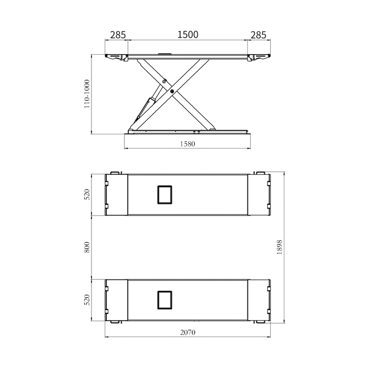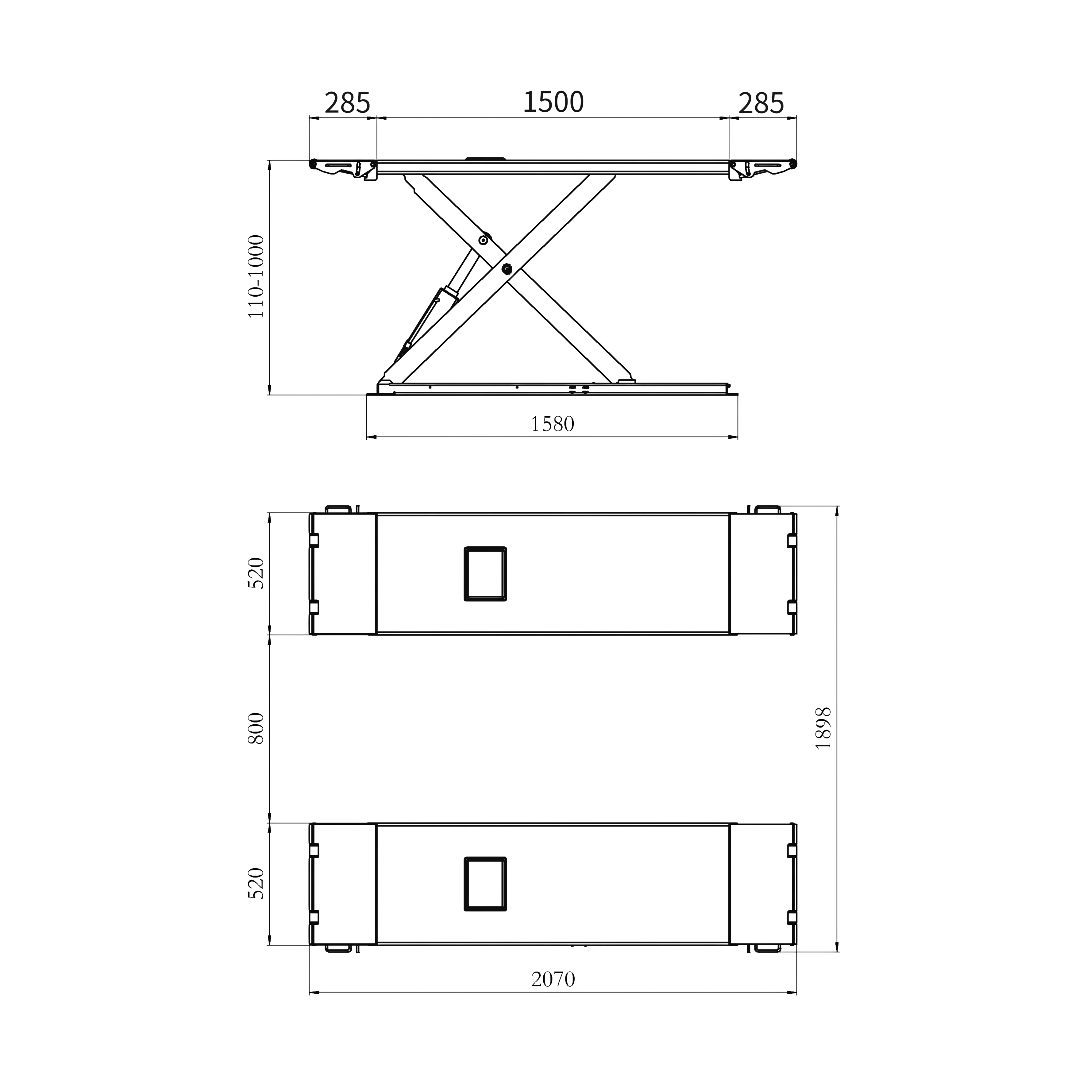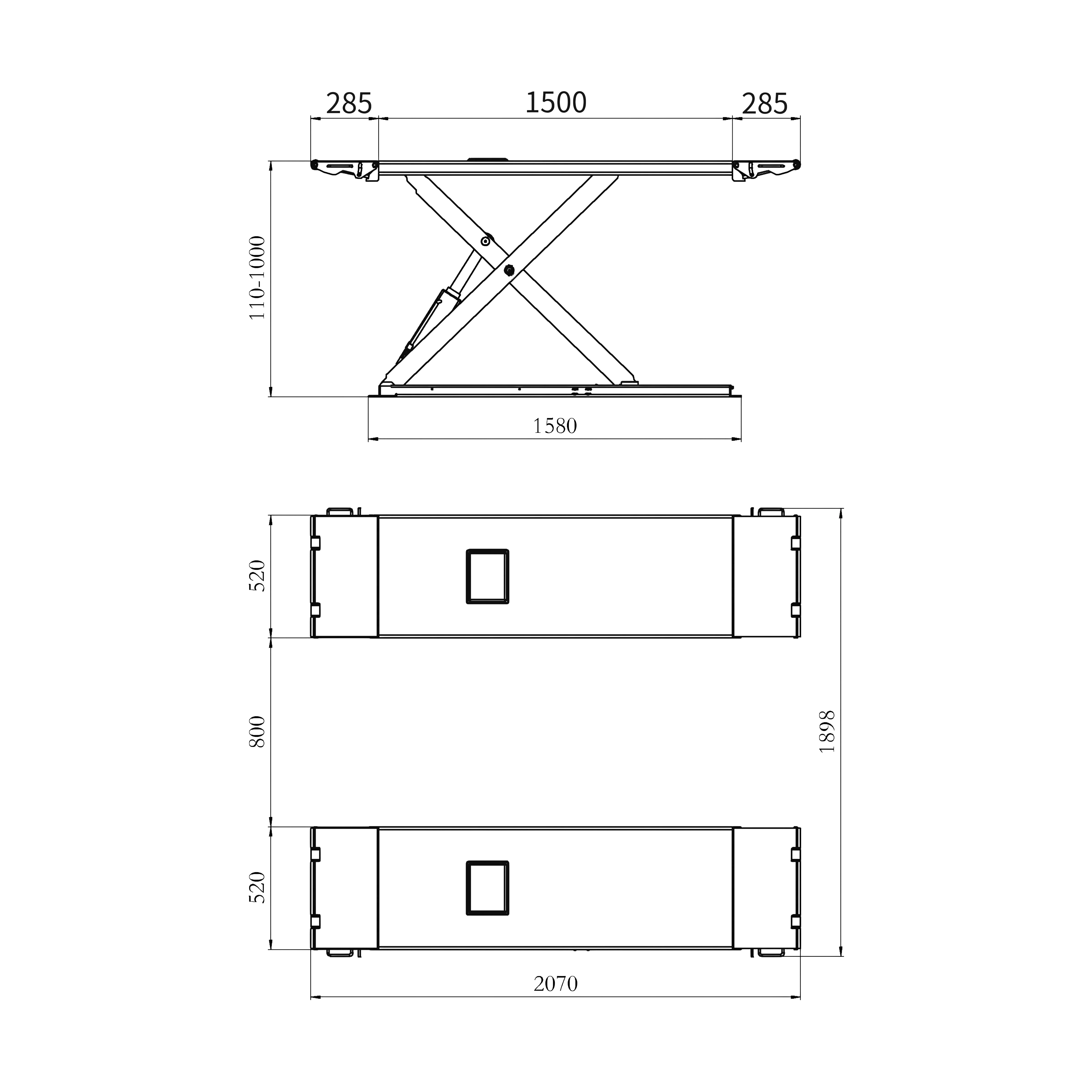 Verlängerbare Plattform: Die Hauptplattform misst 1500 mm, kann jedoch auf 2070 mm erweitert werden, um unterschiedliche Fahrzeuggrößen zu unterstützen.