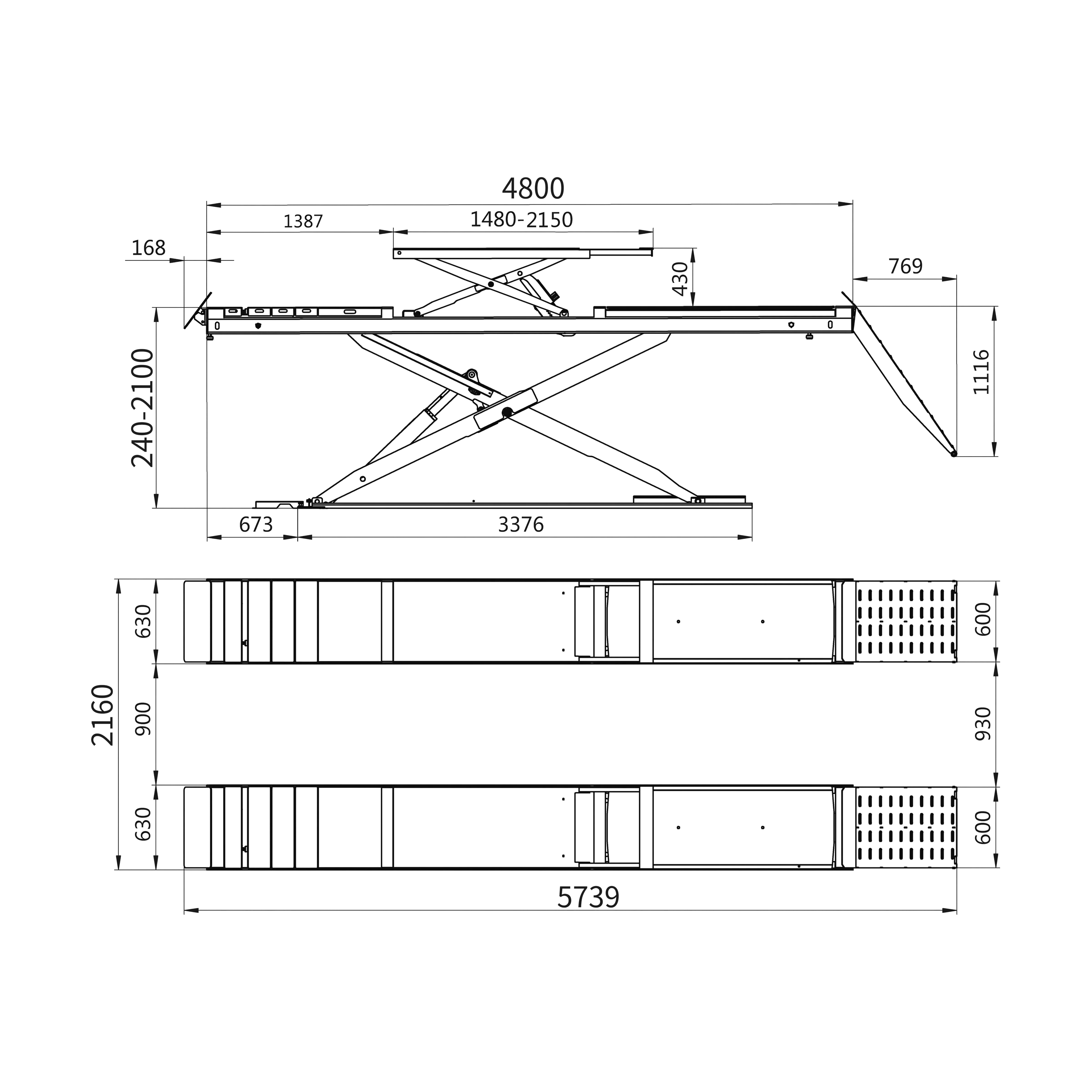 - Maximale Hubhöhe: 2100 mm, was ausreichend Spielraum für die Wartung und Reparatur größerer Fahrzeuge bietet. Die Unterplattform kann für längere Fahrzeuge angepasst werden.